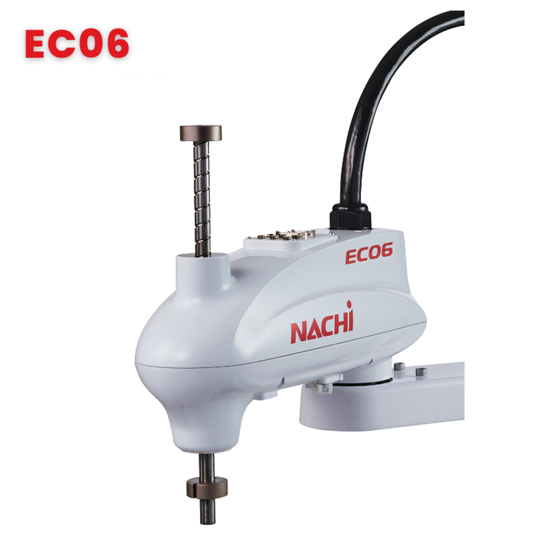 The EC06 series are simple structure robots with high-speed, high precision that meet for applications such as assembling, handling, and so on. Maximum reach can be selected from 3 types: 500mm, 600mm, 700mm. The tip axis is a hollow structure, therefore, tube/hose routing from the robot to the tool is simple. Complex construction is significantly reduced as well.